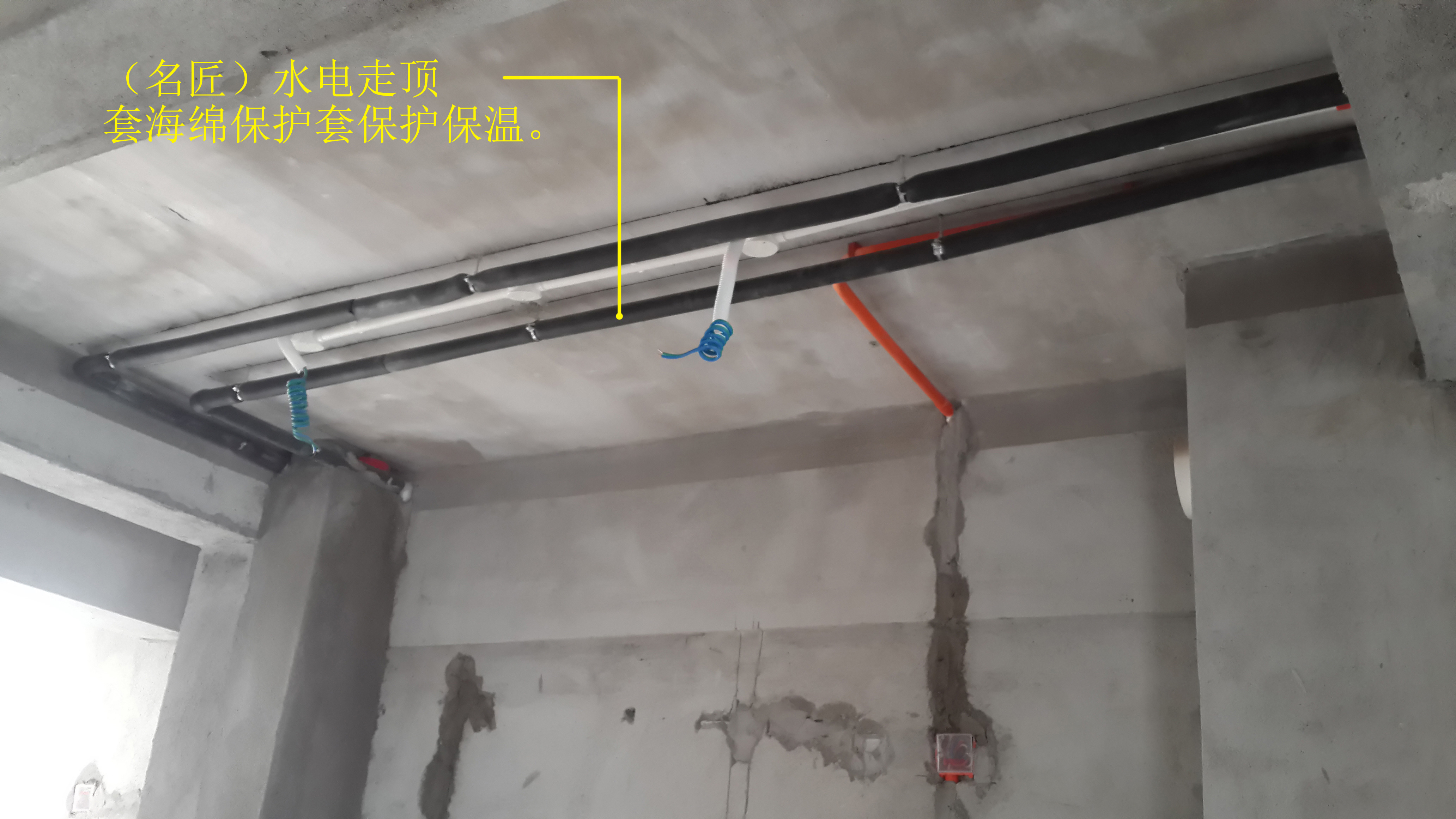 水管采用名匠特供的管材——上海豐果牌納米抗菌PP-R管,是經(jīng)國家衛(wèi)生檢測中心檢驗通過的首家榮獲中國“抗菌標志”產(chǎn)品。電線采用名匠的特供線材——廣州雙菱銅線阻燃雙層保護電纜,是北京水立方核電站選用的線材。為了安全和增強使用壽命,水電走頂,套海綿保護套保護保溫,并且不同功能的線管分不同顏色鋪設(shè),易辨識的同時也對以后的維護帶來極大便利。