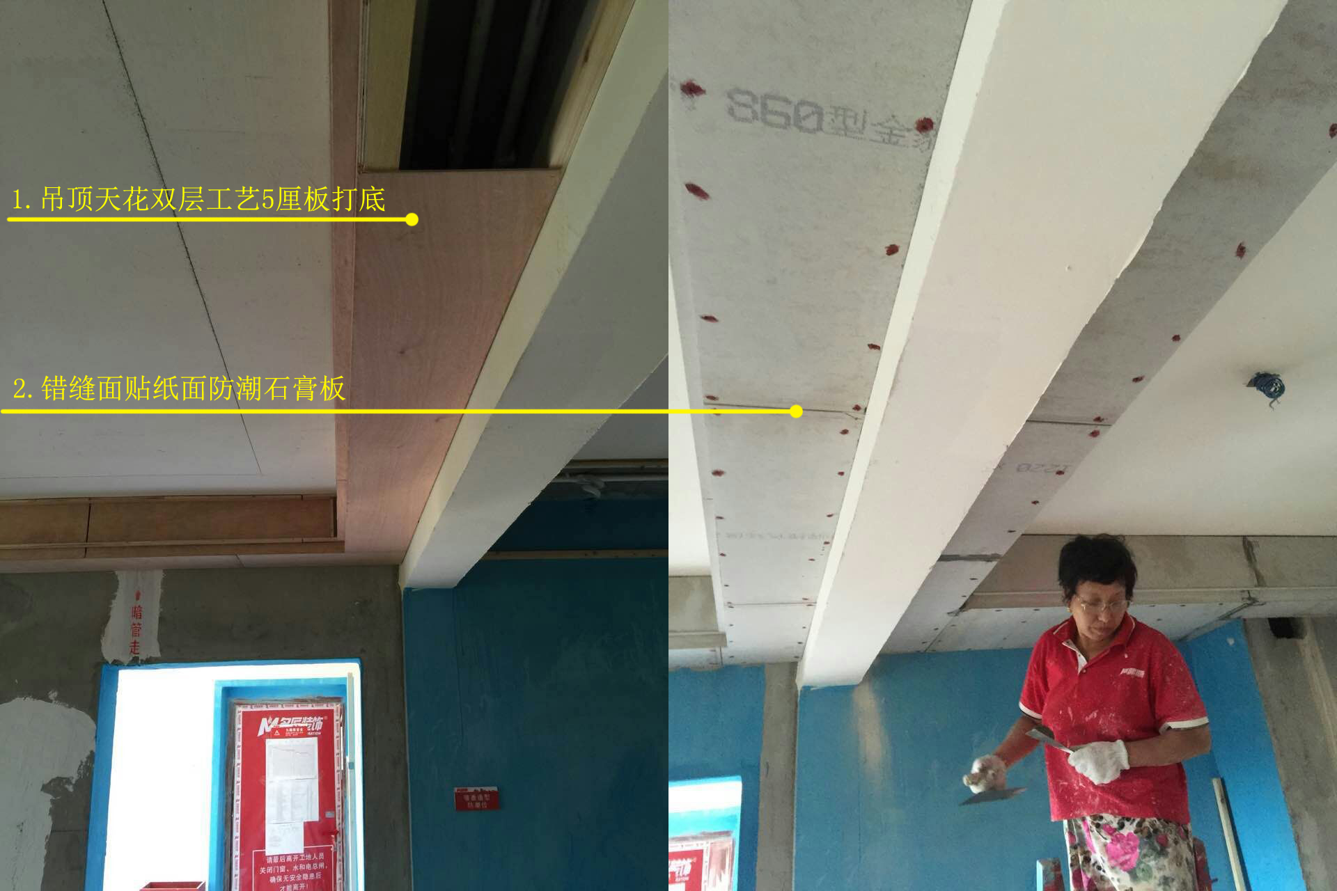 吊頂?shù)牟牧虾褪┕すに囉绊懼蹴斞b修的好壞,名匠裝修現(xiàn)場吊頂采用天花雙層工藝5厘米打底,在錯縫面和貼紙面會使用防潮石膏板,讓吊頂空間更實用。